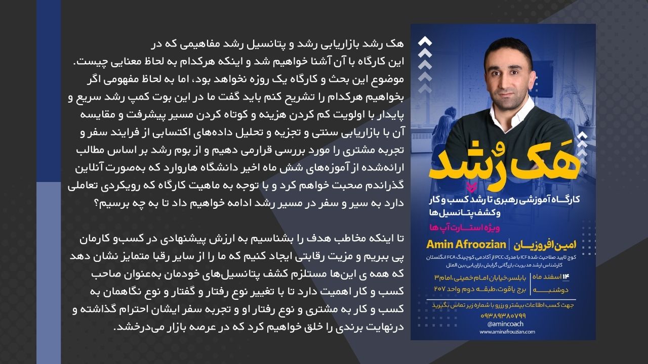 و اما این کارگاه را به شما صاحبین کسبوکار و یا کسانی که در پی ایجاد کسبوکار مولد در سال آینده میباشند، با ذهنیتی که آمادگی ایجاد تغییر دیدگاه در بازاریابی و پیادهسازی سیستم هک رشد و کشف پتانسیل خود در مسیر رشد و کسب سود و ثروت پایدار هستند، پیشنهاد میکنم به امید دیدار شما در این کارگاه بهترینها را از خداوند منان خواستارم…